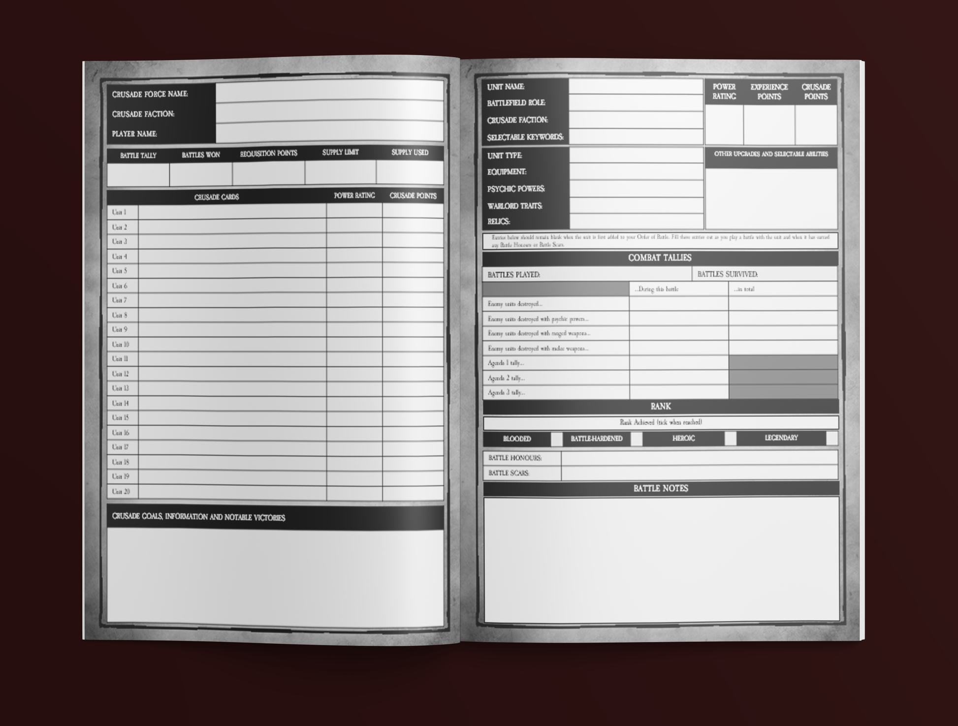Each 202 page features enough space and variety to record up to 8 unique Crusades. Each section contains: an Order of Battle page, 20(!) Crusade card pages, 2 lined pages, a plain page and a hex-grid page - plenty of room for your tactical acumen and campaign notes.
