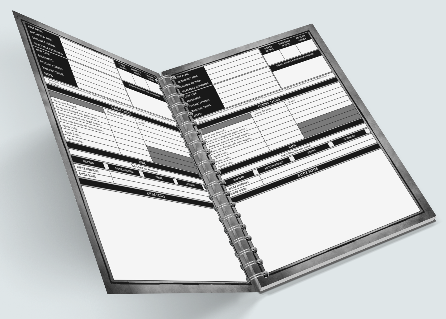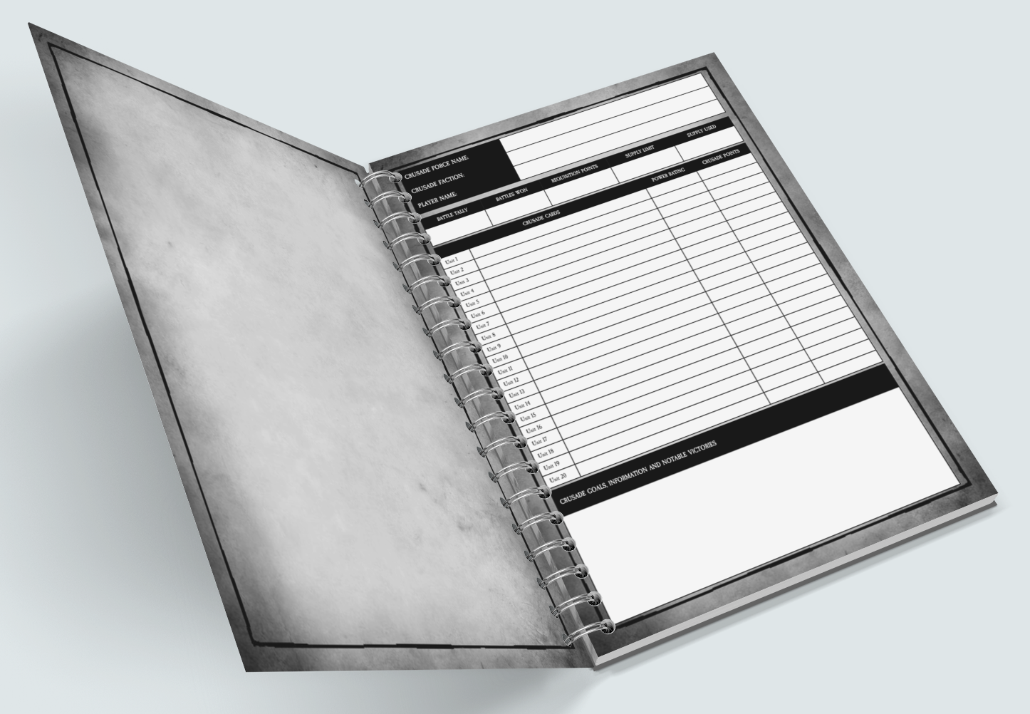 Each 202 page book features enough space and variety to record up to 8 unique crusades. Each section contains: an Order of Battle card page, 20(!) Crusade card pages, 2 lined pages, a plain page and hex-grid page - an ample platform to begin your next sphere of expansion!