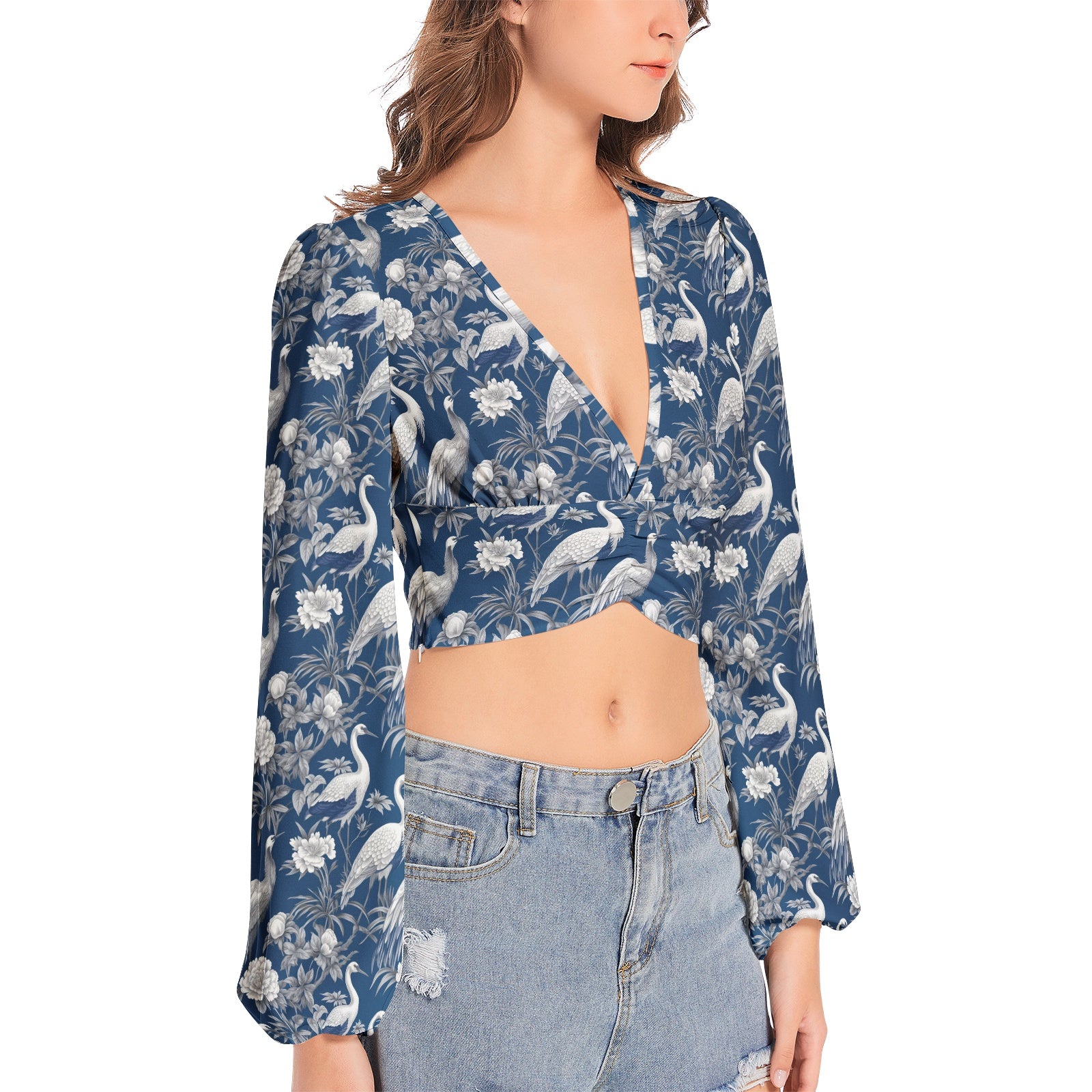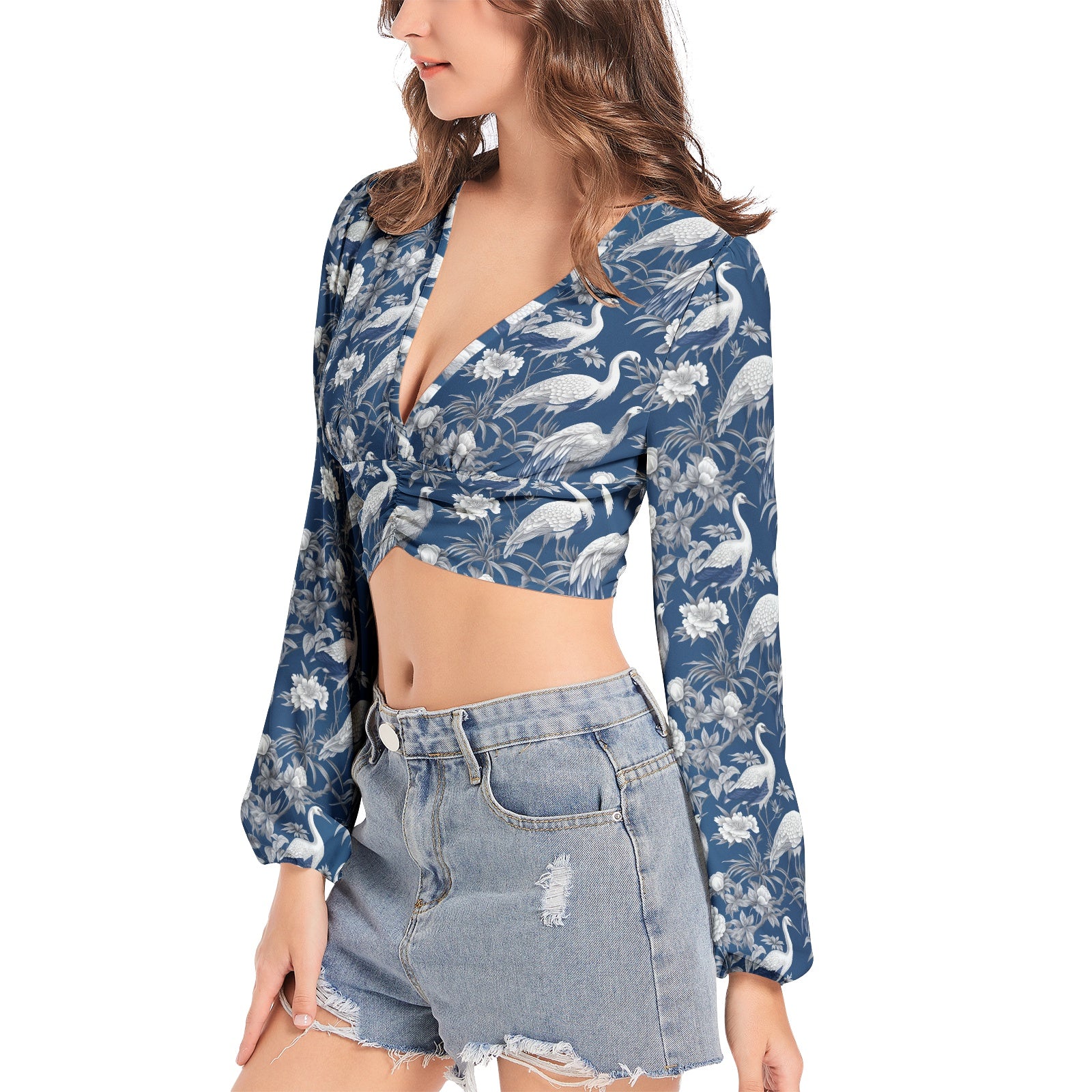 Women's Deep V-Neck Lantern Sleeve Crop Top